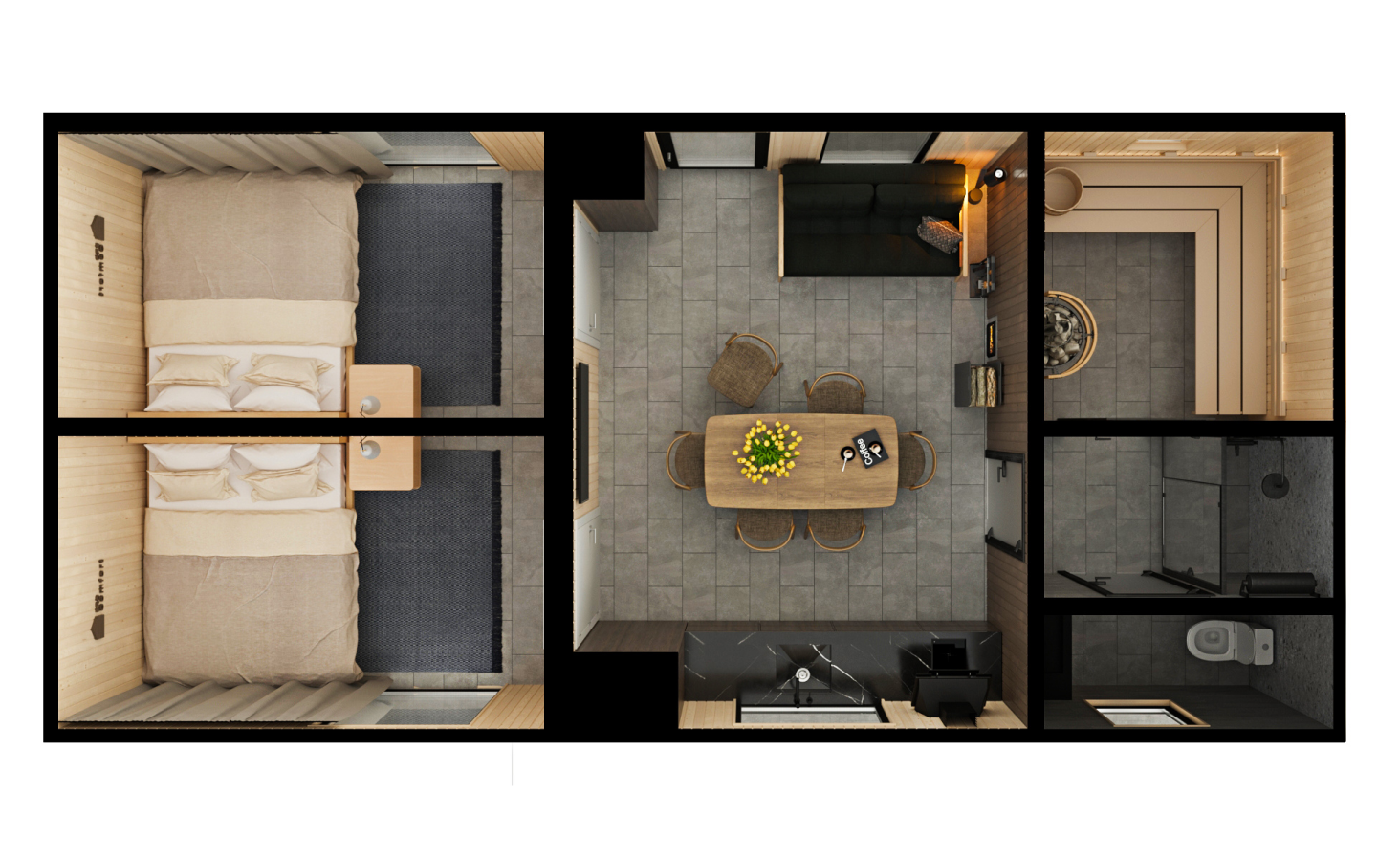 Благодаря двум спальням, четырехмодульная баня идеально подходит для проживания гостей или семьи на выходных. Каждый может наслаждаться комфортом и уютом в собственном пространстве.